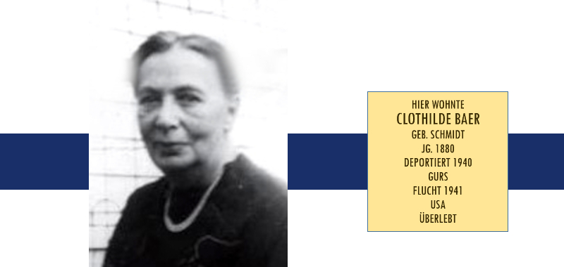 Clothilde Baer wurde im Oktober 1940 nach Gurs in Südfrankreich deportiert. Ihr Sohn beschaffte ihr ein Einreisevisum für die USA. Sie konnte 1941 über Marseille und Lissabon in die USA ausreisen.