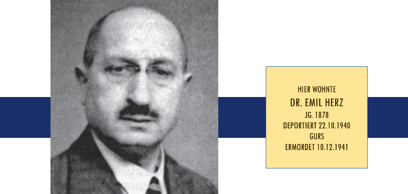 Dr. Emil Herz war als Rechtsanwalt in Ludwigshafen tätig. Unter der Herrschaft der Nationalsozialisten konnte er seinen Beruf nur noch eingeschränkt ausüben. Im Oktober 1940 wurde er mit seiner Ehefrau Herta nach Gurs deportiert. Er verstarb dort im Dezember 1941.