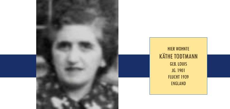 Käthe Hilde Todtmann, geb. Louis, wurde am 22. November 1901 in Pasewalk im Landkreis Vorpommern-Greifswald geboren. Sie heiratete James Todtmann am 25. März 1925 vermutlich in Pasewalk. Dort wurde auch das einzige Kind der beiden geboren. Die Tochter Ellen Lisa Todtmann kam in Pasewalk am 1. Januar 1927 zur Welt.